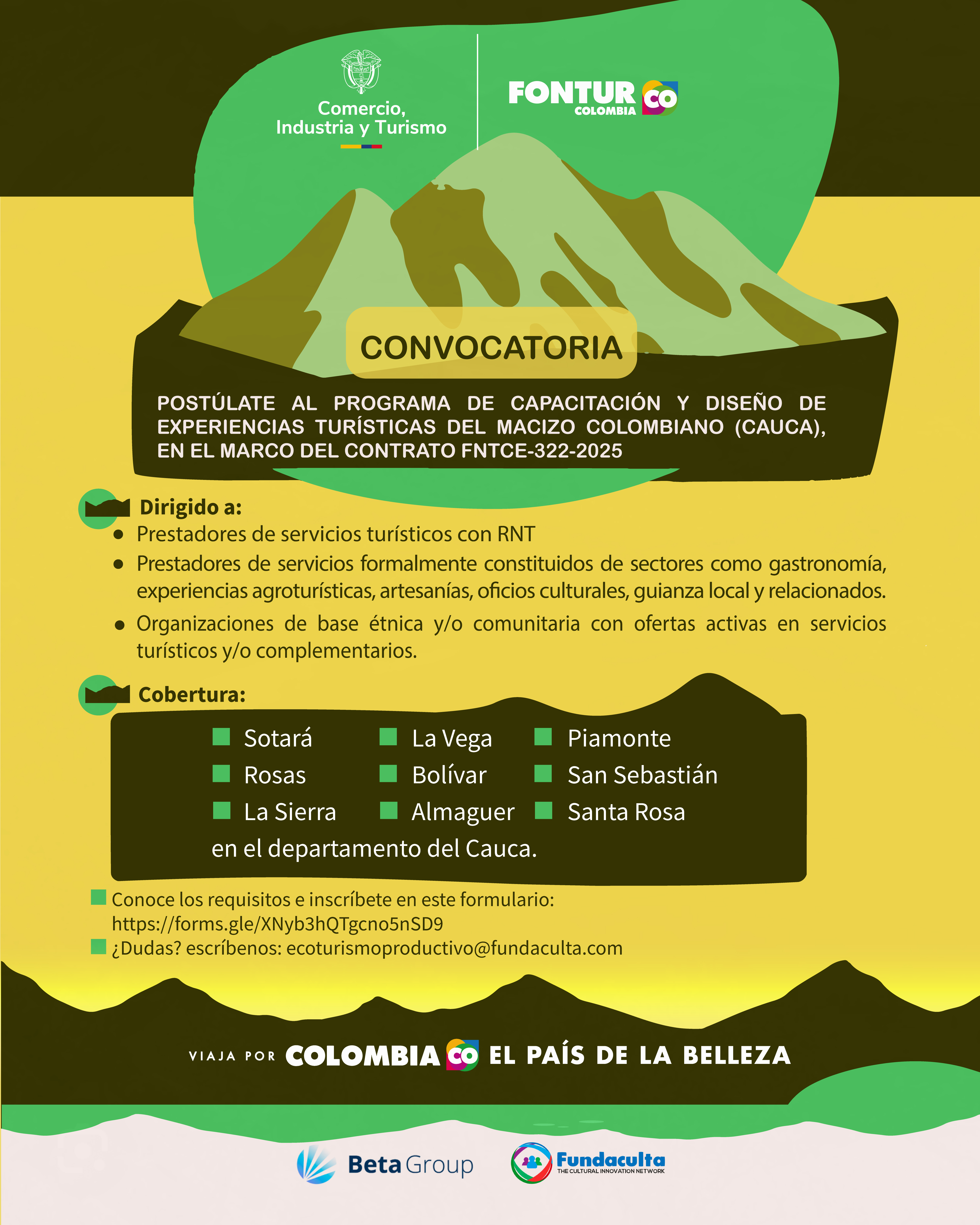 CONVOCATORIA FORTALECIMIENTO DE LA CADENA PRODUCTIVA DE TURISMO DE NATURALEZA EN EL DEPARTAMENTO DEL CAUCA - FNTCE - 322 - 2025